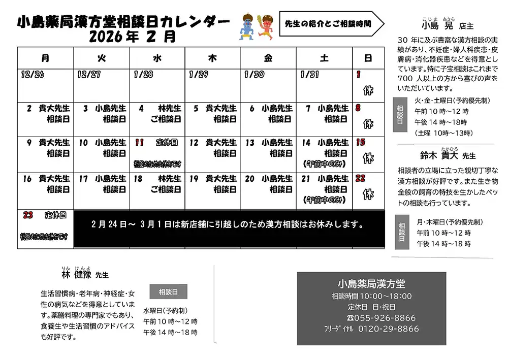 日頃より小島薬局漢方堂をご利用いただき誠にありがとうございます。2017年のオープン以来、多くのお客様に足を運んで頂いた現在の店舗ですが、この度2026年2月21日をもちまして漢方相談部門の業務を終了し、2026年3月に新店舗へと移転することとなりました。詳細は以下よりご確認ください。今後とも変わらぬご愛顧のほどよろしくお願い申し上げます。