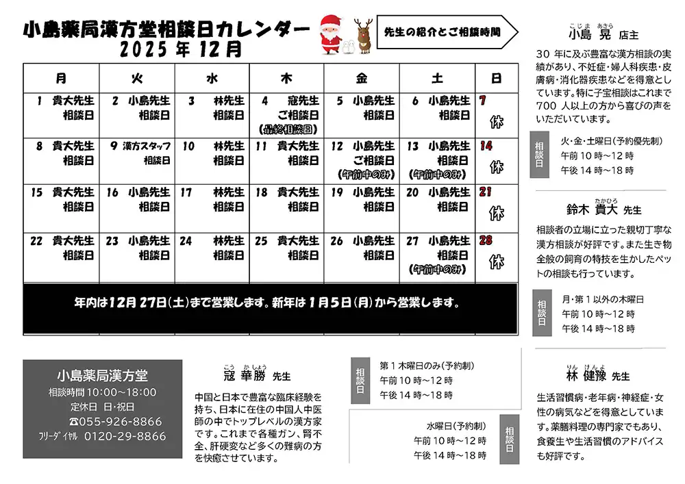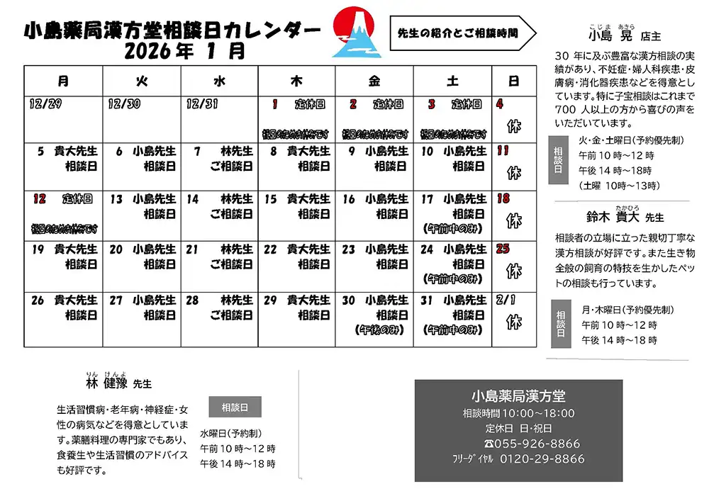 日頃より小島薬局漢方堂をご利用いただき誠にありがとうございます。2017年のオープン以来、多くのお客様に足を運んで頂いた現在の店舗ですが、この度2026年2月21日をもちまして漢方相談部門の業務を終了し、2026年3月に新店舗へと移転することとなりました。詳細は以下よりご確認ください。今後とも変わらぬご愛顧のほどよろしくお願い申し上げます。